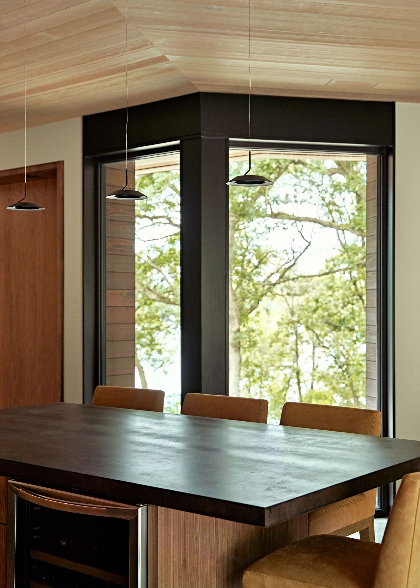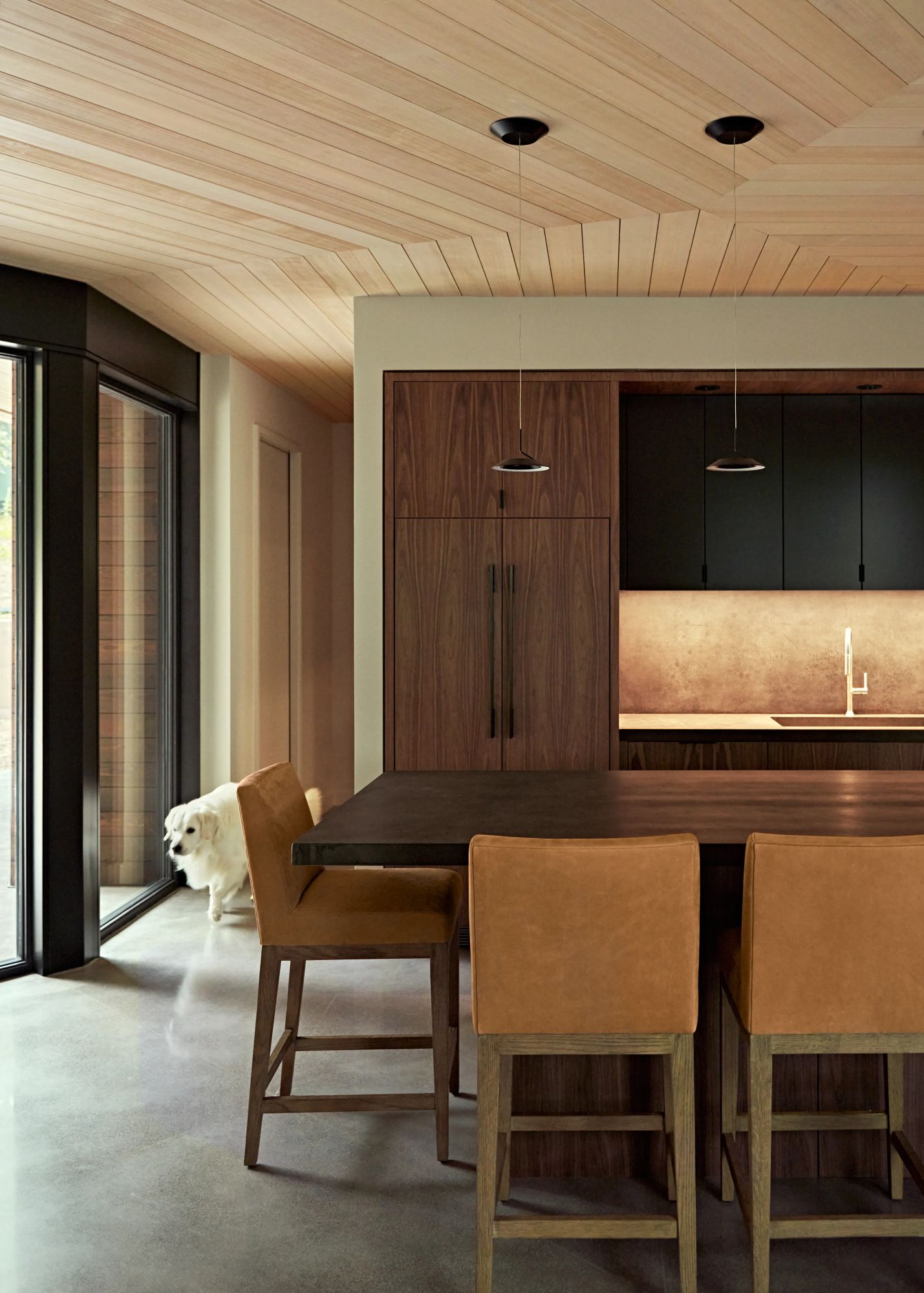 The dramatic knife-edge roofline with seven-foot cantilevered overhangs floats above anchored stone walls, giving the home a sculptural, origami-like presence. Expansive windows bring in light and frame serene views, while every detail—from the low-hipped roofs to the carefully executed joinery—was crafted to meet the clients’ vision of timeless, modern sophistication.