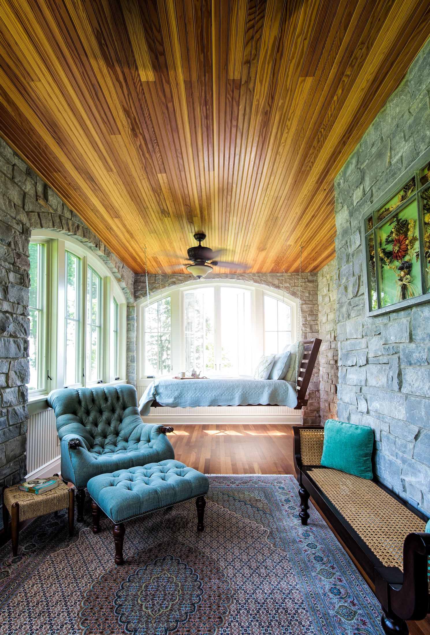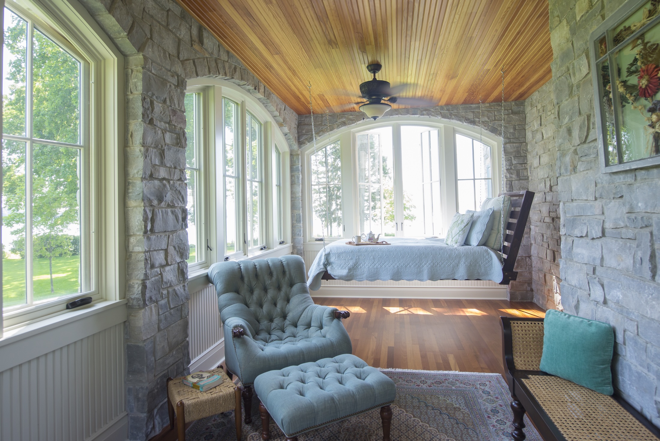 A new upper level includes a primary bedroom with lake views, a sleeping porch, second-floor laundry, and an elevator for accessibility. The lower level balances children’s bedrooms with family gathering spaces. Soaring ceilings, open layouts, and expansive windows bring natural light and water views throughout the home.