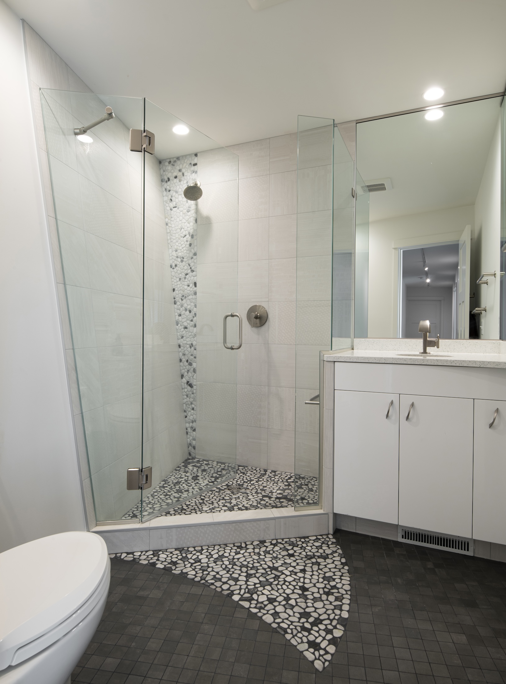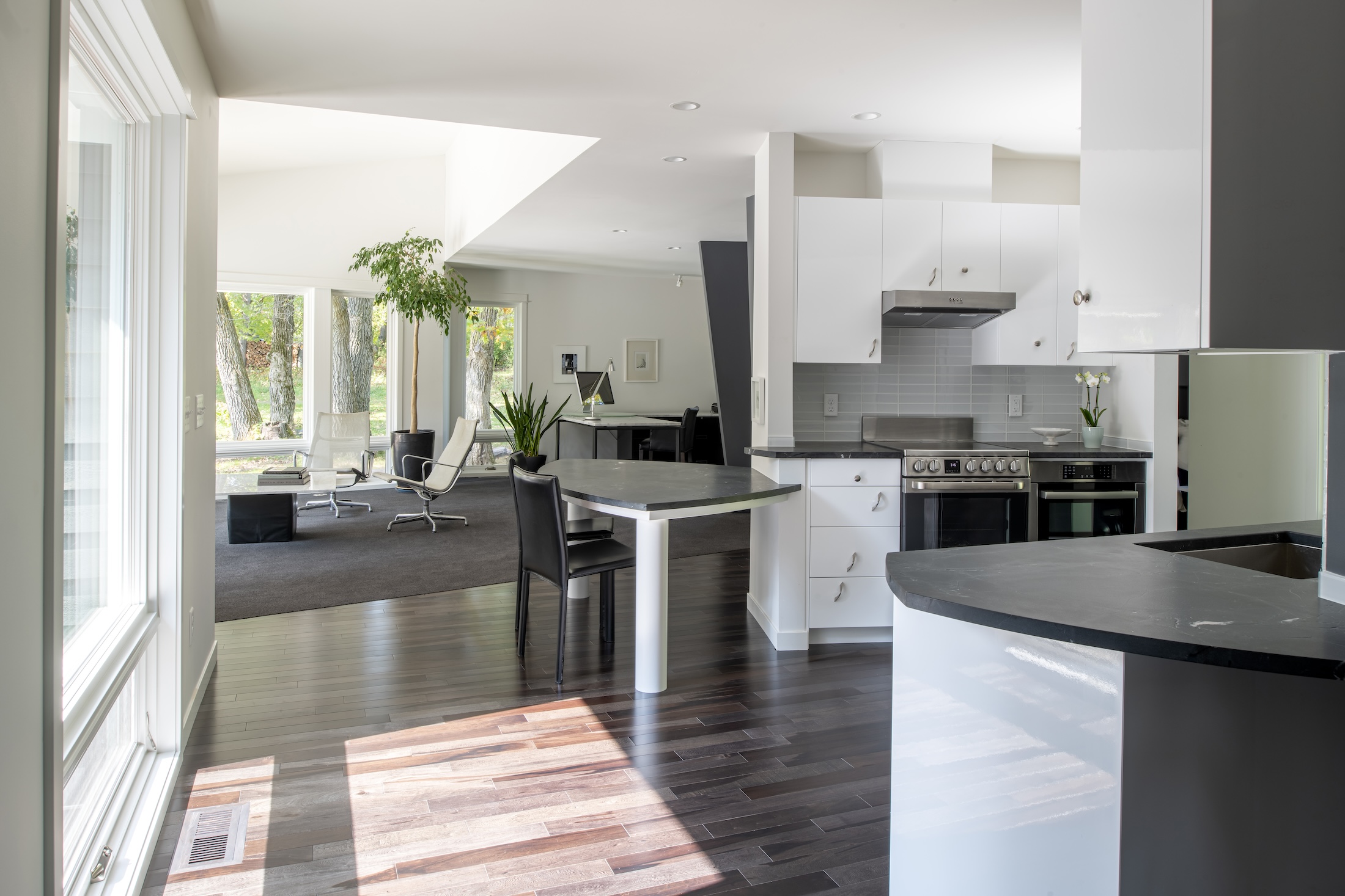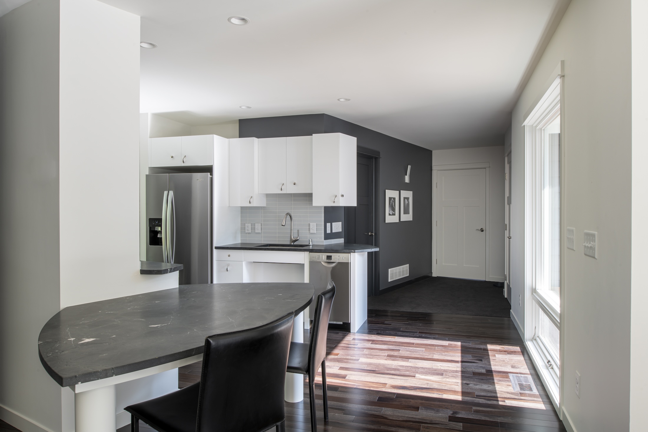 Diagonal dividing walls and angled counters bring a modern, streamlined aesthetic, blending accessibility with striking architectural detail. Every element was carefully considered to create a home that feels personal, comfortable, and distinctive.