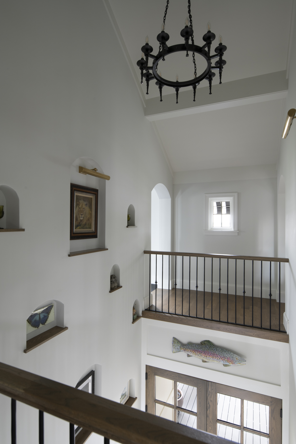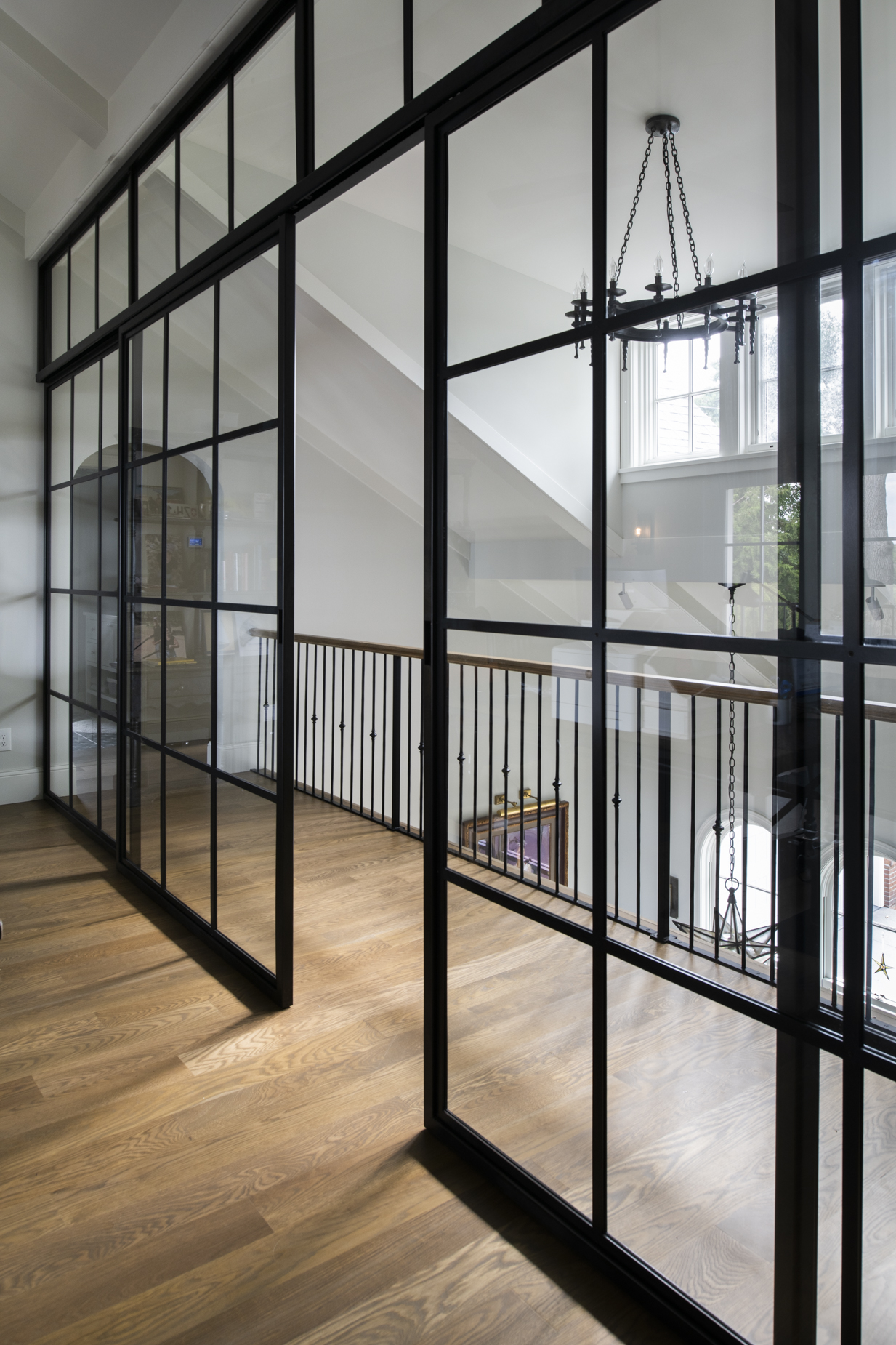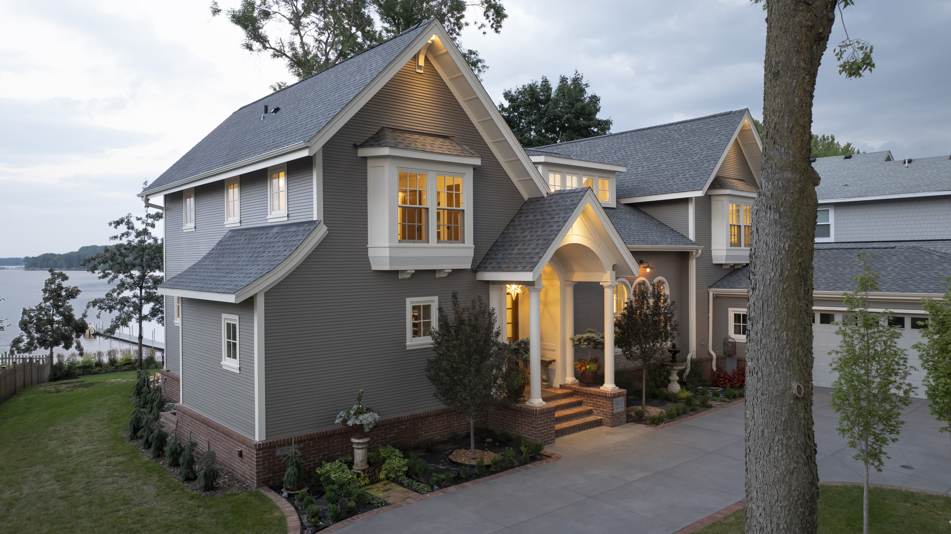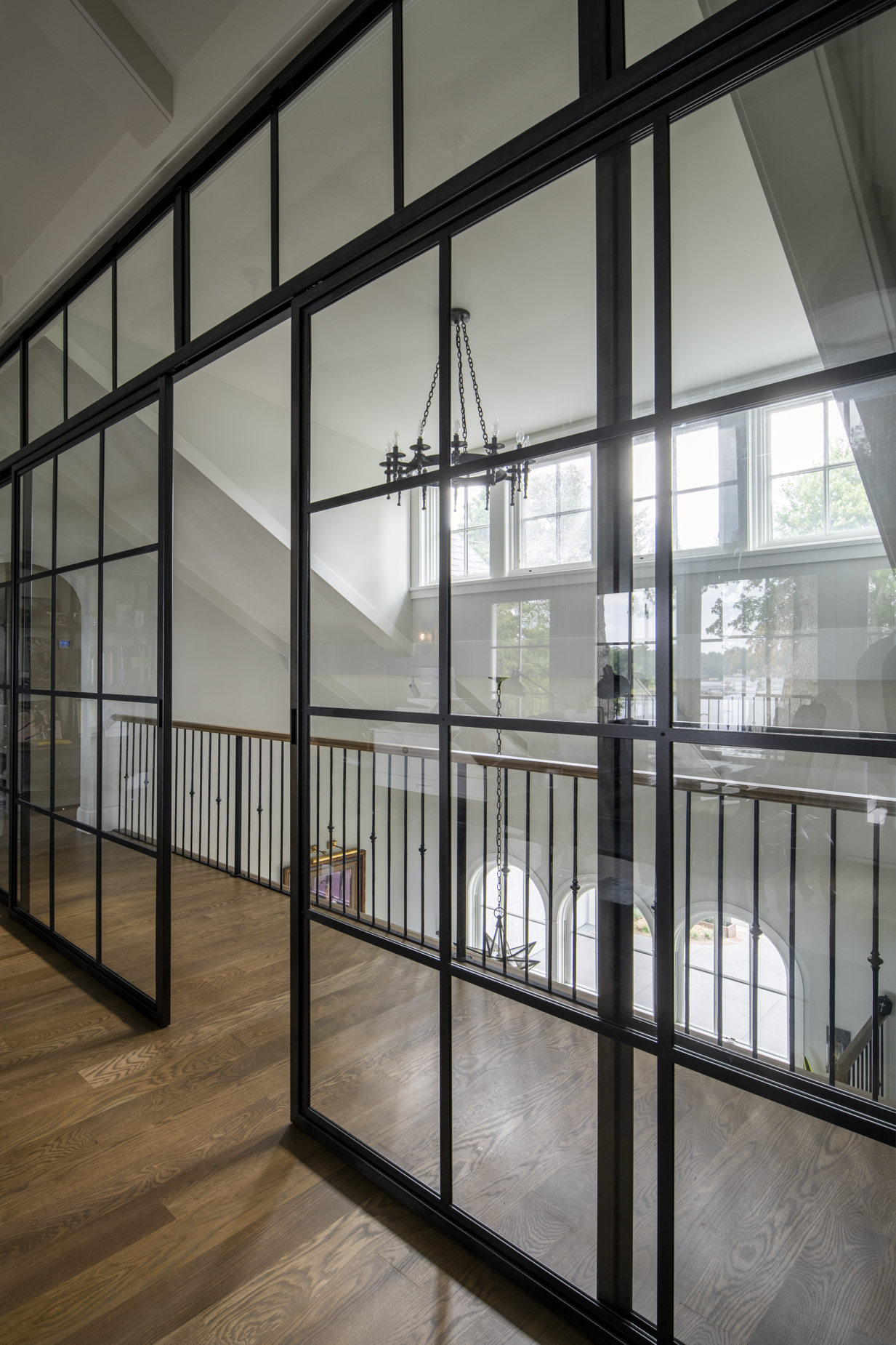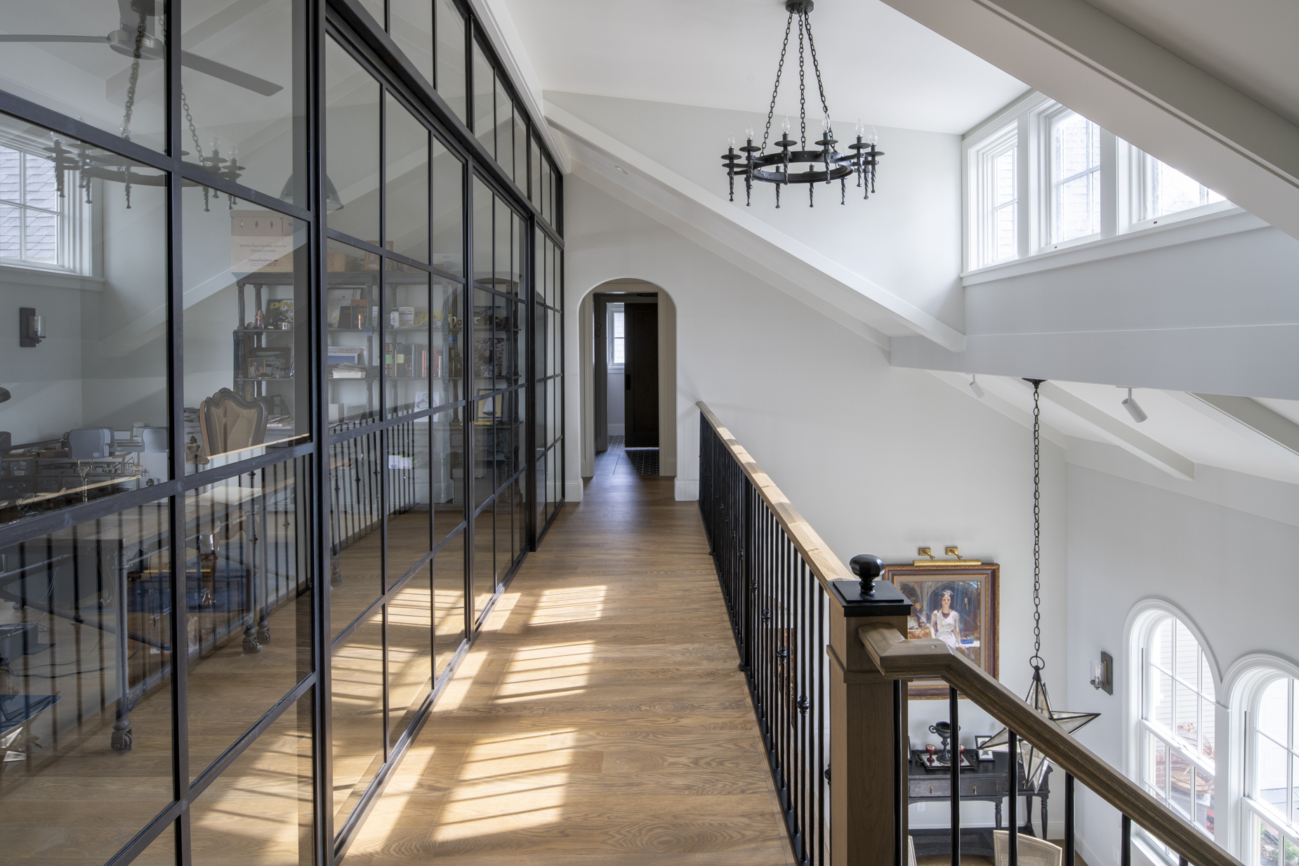Upstairs, bridge-like walkways connect a guest suite, exercise room, and a loft office with a glass wall overlooking the dining room and lake beyond. Crafted to celebrate both daily life and special moments, this home is where their shared story begins.