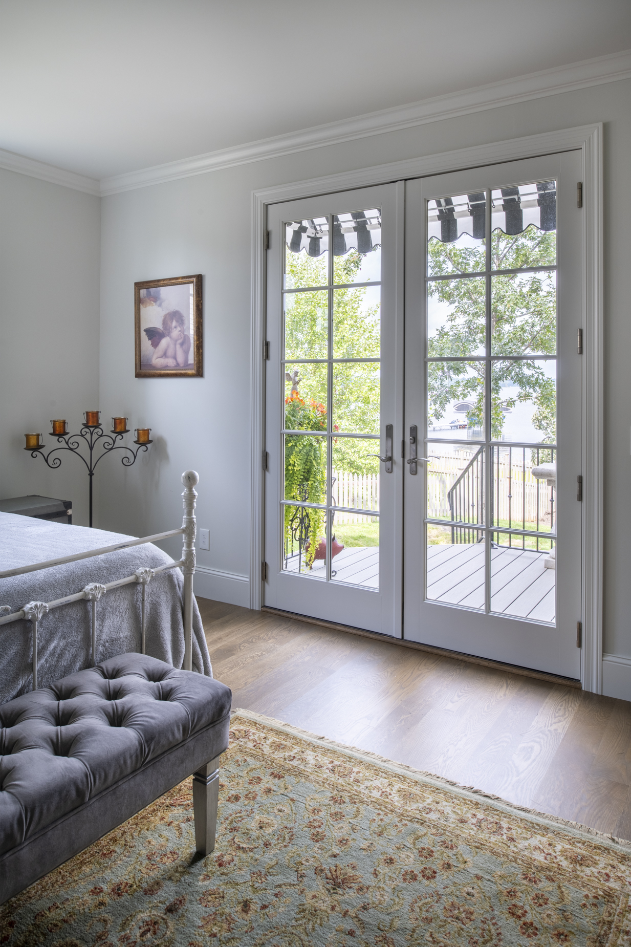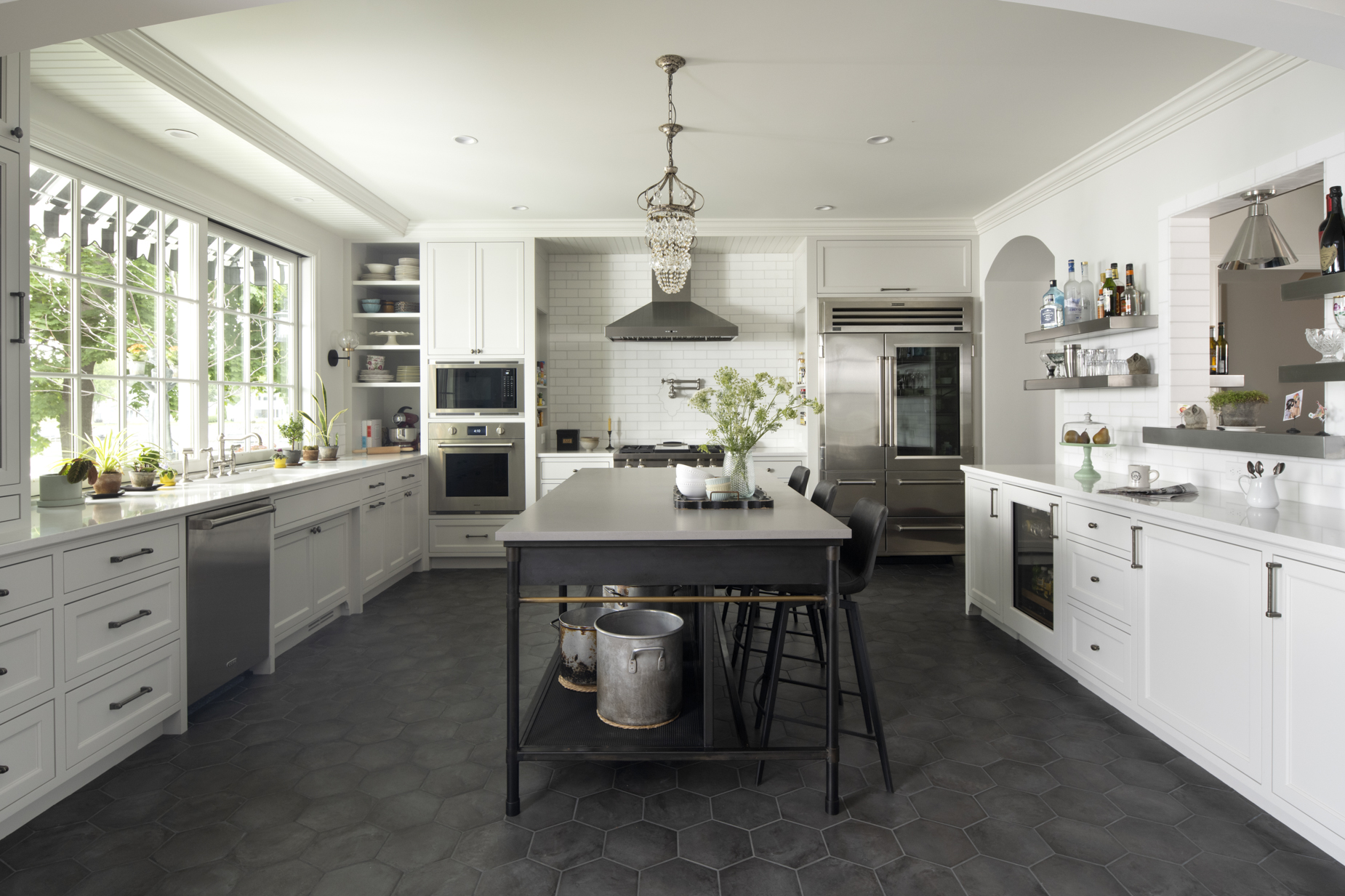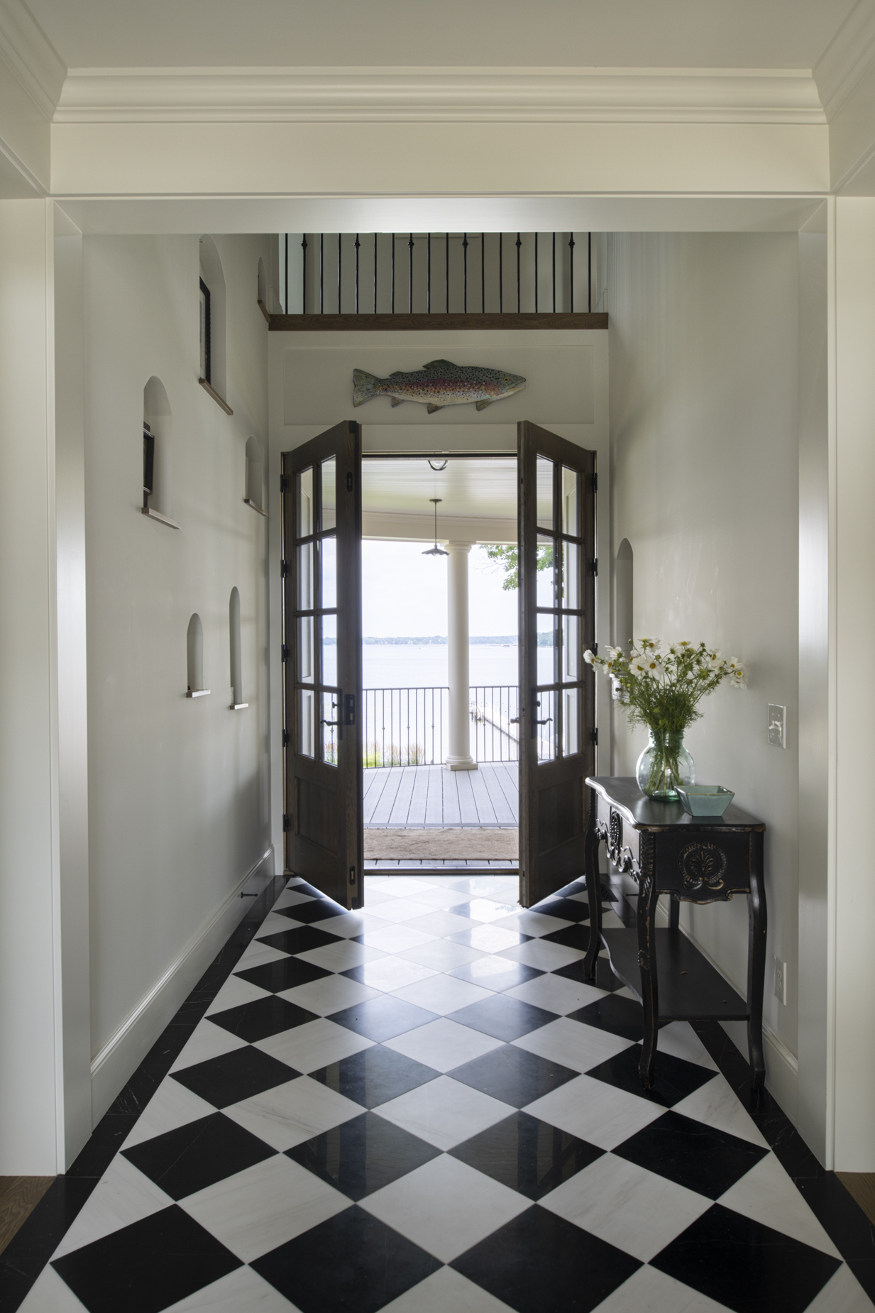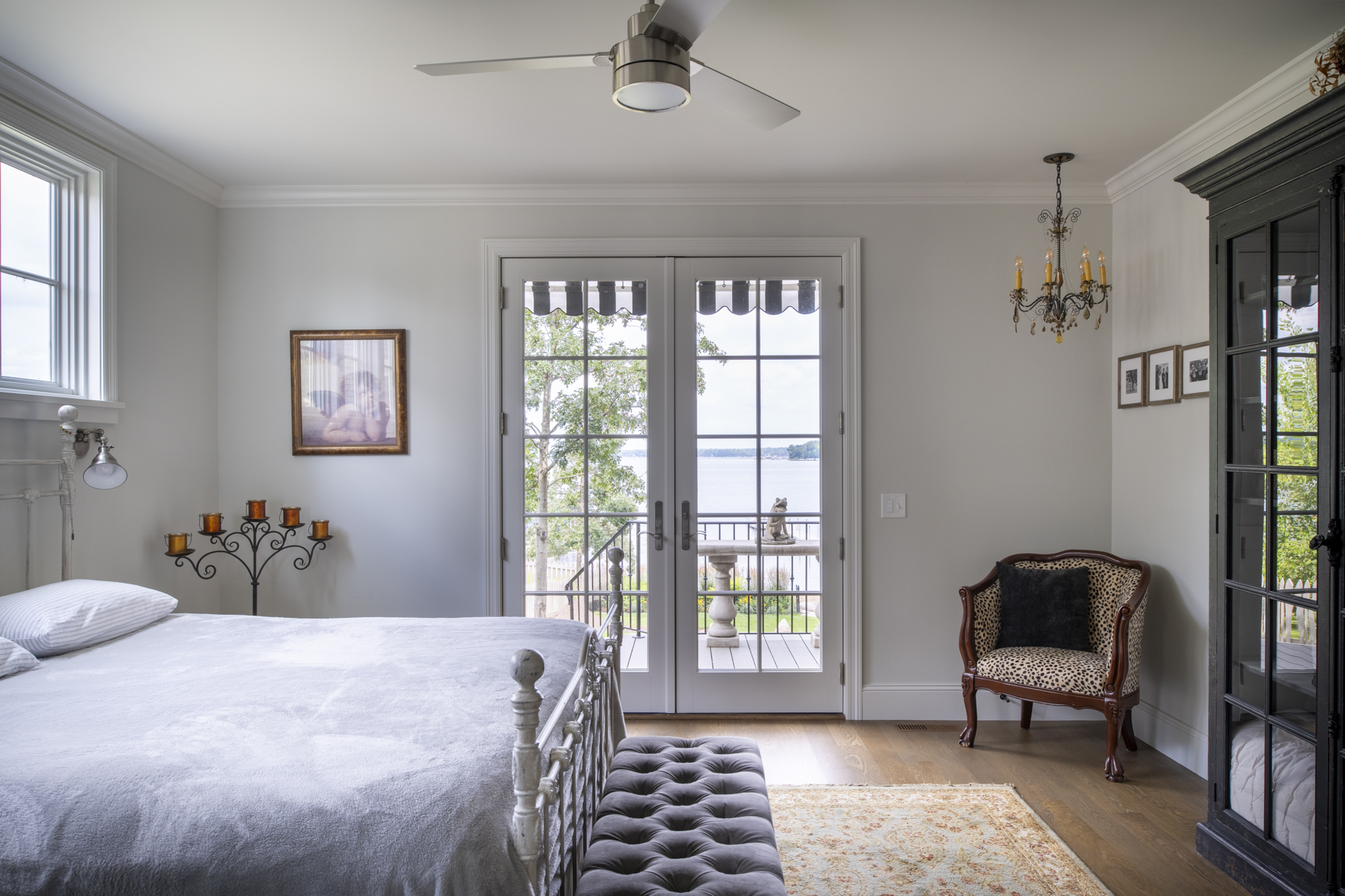 Upon entering, a custom laser-cut screen and a curated wall of art niches introduce the personal character woven throughout. The main living, dining, and kitchen areas flow together and open through a 12-foot automated sliding door to the porch and lake beyond, creating an effortless setting for hosting. Inspired by the owner’s background as a restaurateur, a catering pantry, “expo” counter, and pass-through window to an outdoor bar make entertaining second nature.